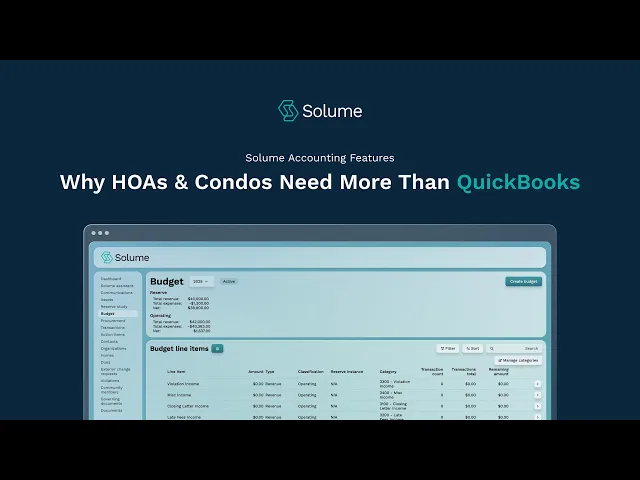 Solume was built for this. It replaces QuickBooks and legacy HOA management companies by combining accounting features, integration capabilities, and reserve study tools into one modern solution. With expense tracking, payment processing, and automated reporting capabilities, it delivers ease of use and security measures designed for community associations.